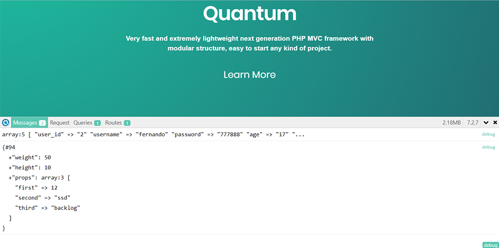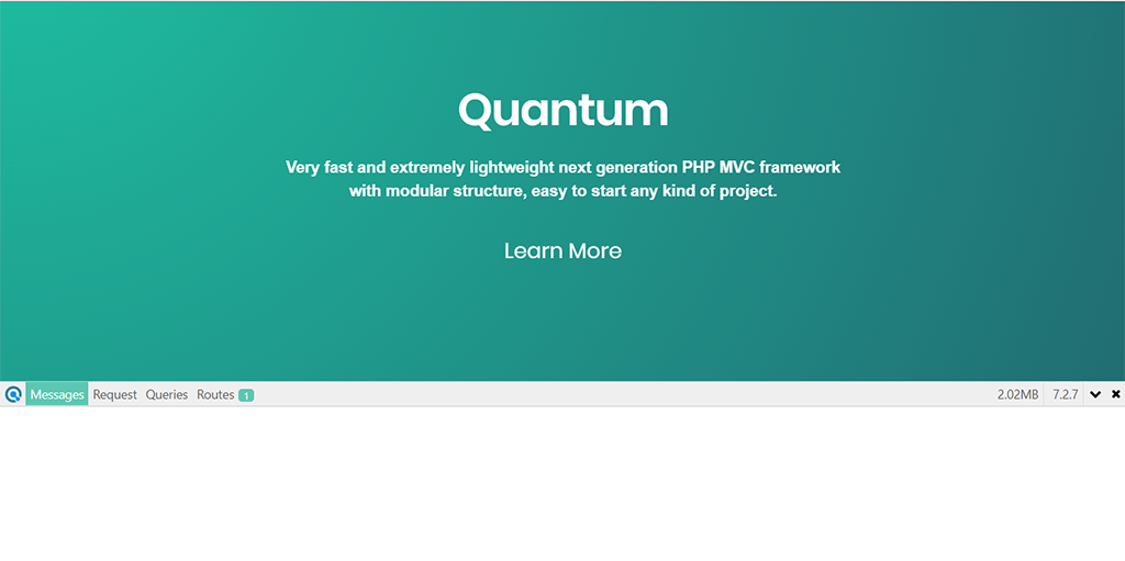 Qauntum comes with `Debugger` library based on maximebf/php-debugbar package. The Debugger, once enabled, will show the Debugbar at the bottom of the page. The Debugbar is set of tabs that display various debug information about the current request, route, queries, variables states and more.
